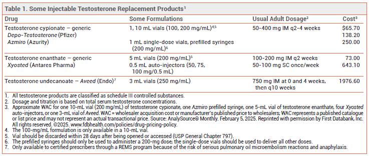 The FDA has approved Azmiro (Azurity), the first injectable formulation of testosterone cypionate to become available in single-dose vials and prefilled syringes for treatment of males with conditions associated with a deficiency or absence of endogenous testosterone. Injectable testosterone cypionate has been available in multidose vials (Depo-Testosterone, and generics) for many years. Testosterone enanthate (Xyosted) is available in prefilled autoinjectors for use in adult men.1 No testosterone products are approved for treatment of low testosterone levels due solely to aging. All testosterone products are classified as schedule III controlled substances.