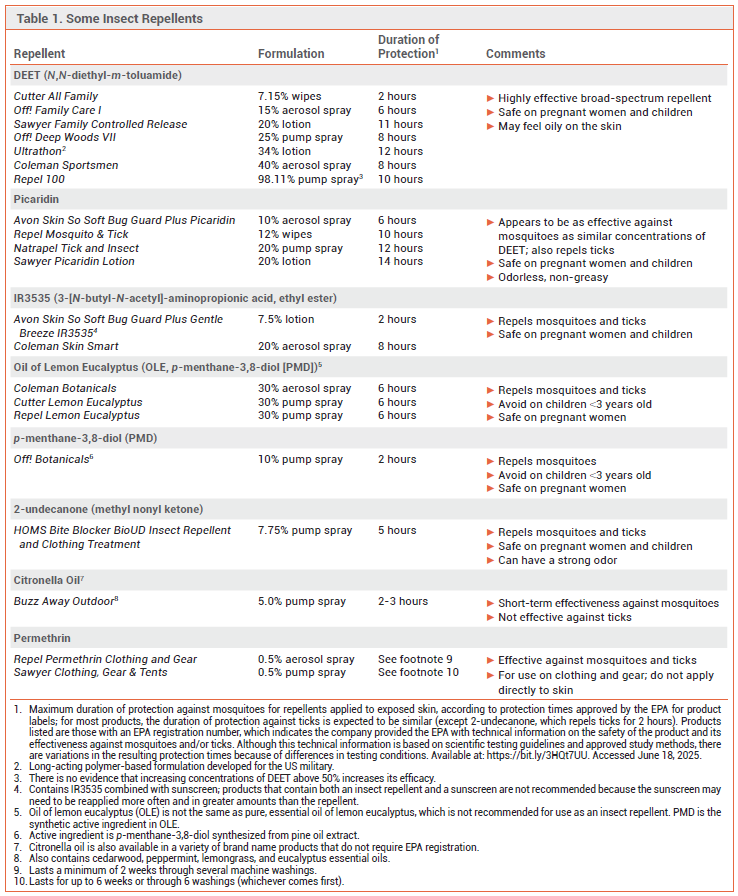 The Centers for Disease Control and Prevention (CDC) and the Environmental Protection Agency (EPA) recommend using insect repellents to avoid being bitten by mosquitoes, ticks, and other arthropods that transmit disease-causing pathogens. Repellents applied to exposed skin should be used in conjunction with other preventive measures such as wearing long-sleeved shirts, pants, and socks and avoiding outdoor activities during peak mosquito-biting times.1 Some insect repellents are listed in Table 1.