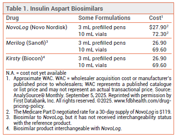 CONCLUSION — The biosimilar insulin aspart Kirsty can be substituted for NovoLog by the pharmacist without permission from the prescriber. Kirsty will presumably be less expensive than NovoLog.