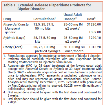CONCLUSION — Uzedy, an extended-release, subcutaneously administered formulation of risperidone approved for maintenance treatment of bipolar I disorder, extends the interval between injections from every 2 weeks with intramuscular risperidone formulations to once monthly. Unlike with intramuscular formulations of risperidone, Uzedy does not require concomitant administration of oral risperidone after the first injection to maintain therapeutic levels of the drug. Uzedy does not appear to offer any advantage in efficacy or safety over other injectable formulations of risperidone.