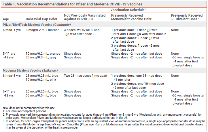 All persons ≥6 months old who completed a primary series with the Pfizer or Moderna monovalent vaccine may now receive a single dose of bivalent vaccine; an additional bivalent dose can generally be given to persons ≥65 years old and to those with significant immunocompromise. For unvaccinated persons ≥5 years old (Pfizer) or ≥6 years old (Moderna), a single bivalent dose is now recommended for primary immunization; multiple doses are recommended for younger children. The new recommendations for the Pfizer and Moderna vaccines are summarized in Table 1.1-3